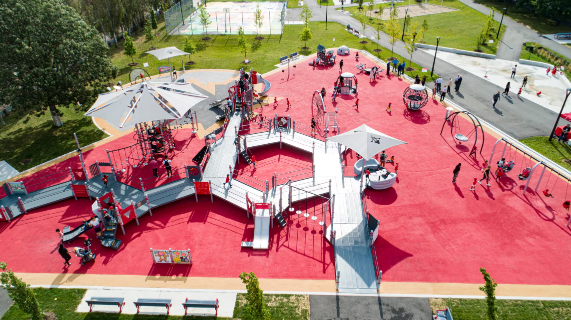 Le parc comprend des rampes pour monter sur les modules de jeu et des balançoires de différentes formes. Ceci permet l’accès aux utilisateurs, peu importe la limitation fonctionnelle. On peut même y jouer au basketball sur un terrain accessible en fauteuil roulant!